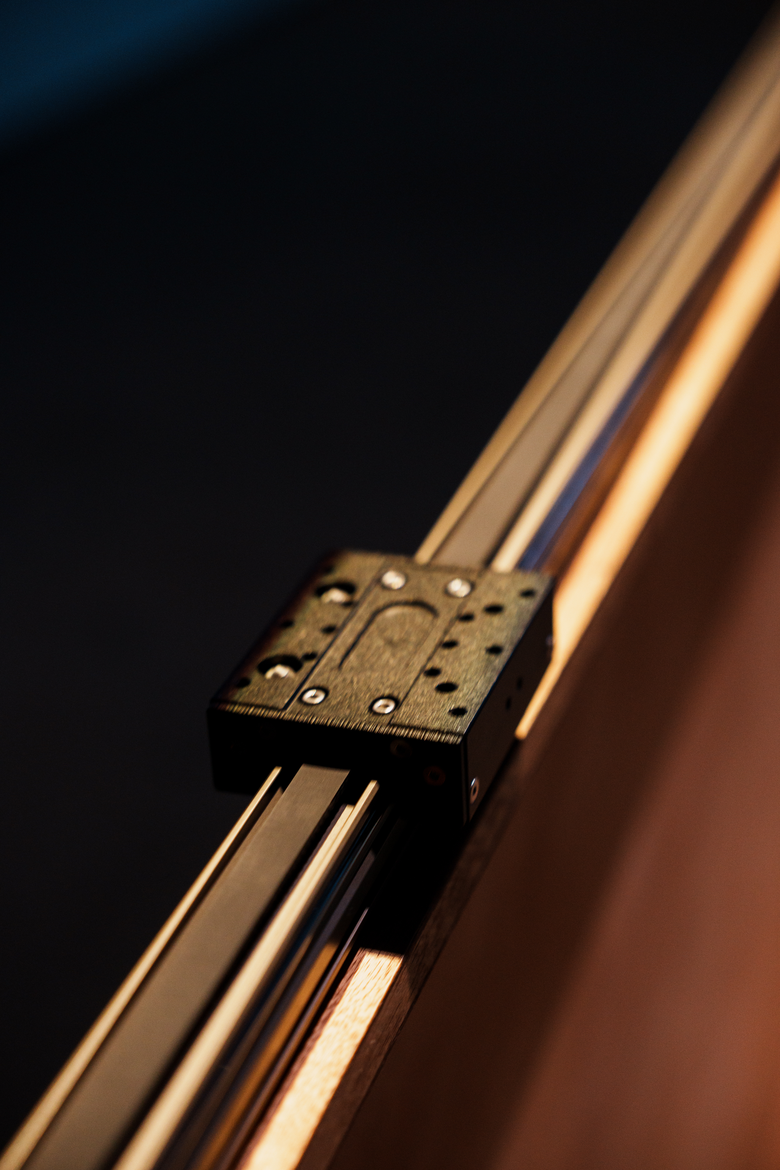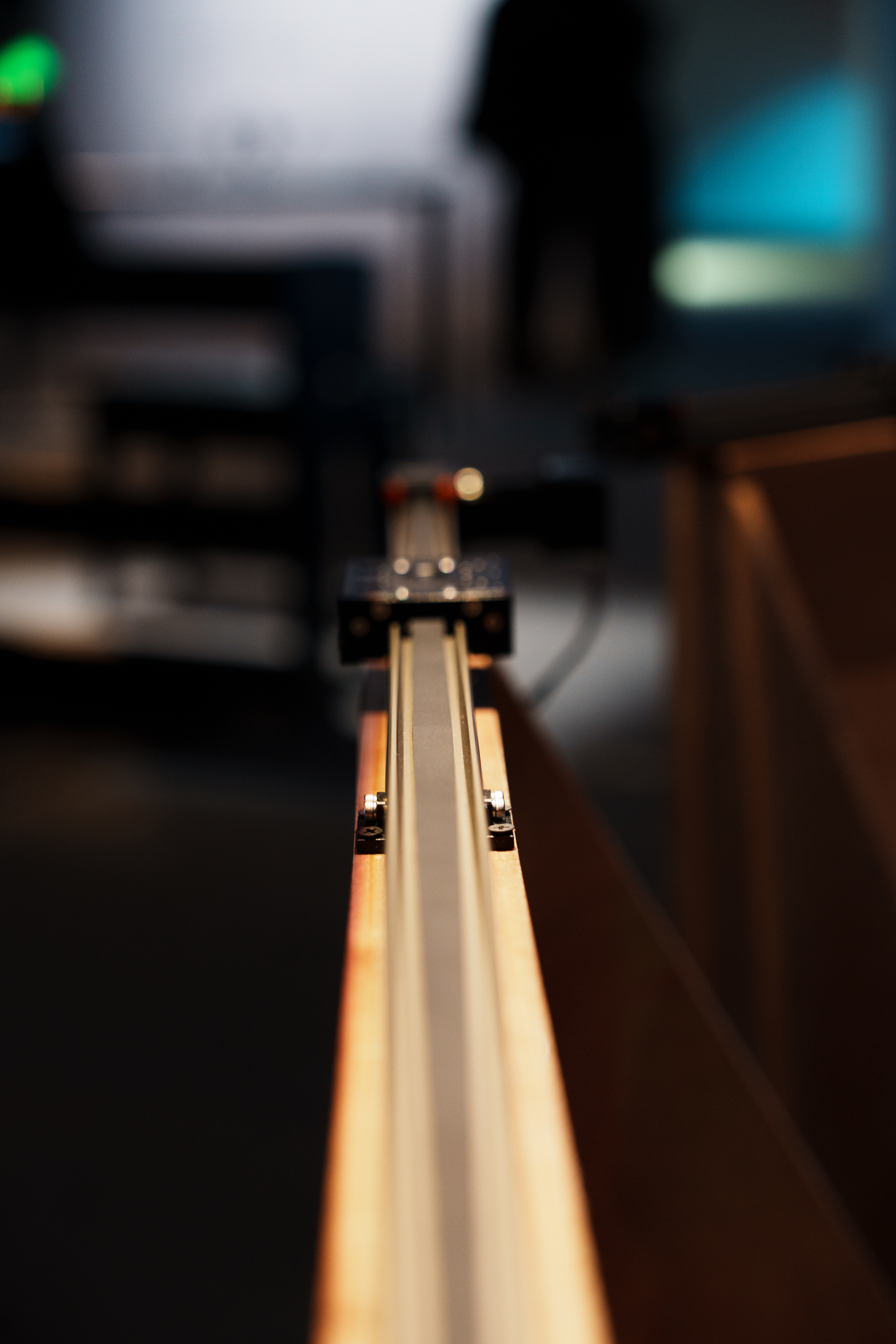 後來,我發現了滑台這個媒材。滑台在不同的移動速度和頻率下,會產生相應的音高和節奏。當我編程控制四台滑台同時運作時,它們發出的聲音就像合唱團一樣融和起來。滑台的移動、觀眾的移動,以及音樂般的聆聽經驗三者彼此緊密相連。